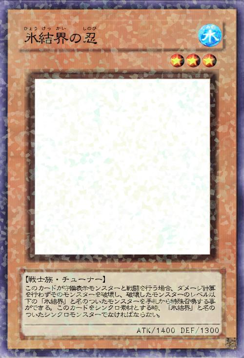 | このカードが守備表示モンスターと戦闘を行う場合、ダメージ計算を行わずそのモンスターを破壊し、破壊したモンスターのレベル以下の「氷結界」と名のついたモンスターを手札から特殊召喚する事ができる。このカードをシンクロ素材とする時、「氷結界」と名のついたシンクロモンスターでなければならない。 | |||
