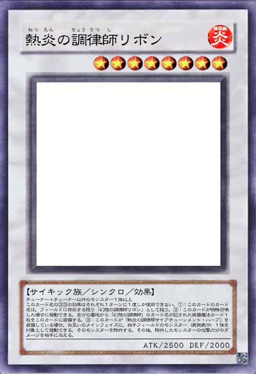 | チューナー+チューナー以外のモンスター1体以上 このカード名の②③の効果はそれぞれ1ターンに1度しか使用できない。①:このカードのカード名は、フィールドに存在する限り「幻想の調律師リボン」として扱う。②:このカードが特殊召喚した場合に発動できる。自分の墓地から「幻想の調律師」のカード名が記された装備魔法カード1枚をこのカードに装備する。③:このカードが「熱炎の調律琴サイアチューンメント・ハープ」を装備している場合、お互いのメインフェイズに、相手フィールドのモンスター(表側表示)1体を対象として発動できる。そのモンスターを除外する。その後、除外したモンスターの攻撃力分のダメージを相手に与える。 | |||