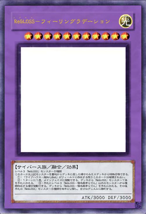 | レベル3「ReGLOSS」モンスター5種類 このカードは上記モンスターを墓地からデッキに戻した場合のみEXデッキから特殊召喚できる。 ①:「ライブハウス-超VeryBad」がフィールドに存在する限りこのカードは破壊されない。 ②:1ターンに1度、メインフェイズに発動できる。デッキから「ReGLOSS」モンスター1体を手札に加える。 ③:手札にレベル3「ReGLOSS-儒烏風亭らでん」以外のモンスターが4種類存在する場合発動できる。デッキから「ReGLOSS-儒烏風亭らでん」を手札に加える。その後手札の「ReGLOSS」モンスター5種類を相手に公開し、自分はデュエルに勝利する。 | |||