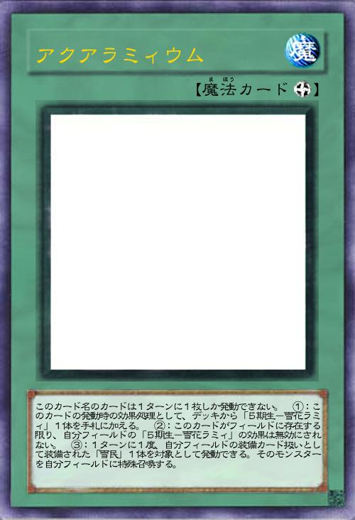 | このカード名のカードは1ターンに1枚しか発動できない。 ①:このカードの発動時の効果処理として、デッキから「5期生-雪花ラミィ」1体を手札に加える。 ②:このカードがフィールドに存在する限り、自分フィールドの「5期生-雪花ラミィ」の効果は無効にされない。 ③:1ターンに1度、自分フィールドの装備カード扱いとして装備された「雪民」1体を対象として発動できる。そのモンスターを自分フィールドに特殊召喚する。 | |||