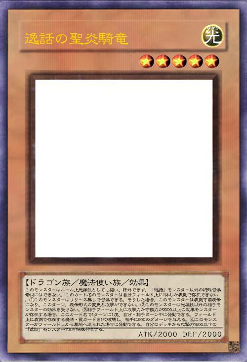 | このモンスターはルール上光属性としても扱い、除外できず、「逸話」モンスター以外の特殊召喚素材にはできない。このカード名のモンスターは自分フィールド上に1体しか表側で存在できない。①このモンスターはリリース無しで召喚できる。そうした場合、このモンスターは表側守備表示になり、このターン、表示形式の変更と攻撃ができない。②このモンスターは光属性以外の相手モンスターの効果を受けない。③相手フィールド上に攻撃力か守備力が2000以上の効果モンスターが存在する場合、このカード名で1ターンに1度、自分・相手ターン中に発動できる。フィールド上に表側で存在する魔法・罠カードを1枚破壊し、相手に500のダメージを与える。④このモンスターがフィールド上から墓地へ送られた場合に発動できる。自分のデッキから攻撃力1500以下の「逸話」モンスター1体を特殊召喚する。 | |||