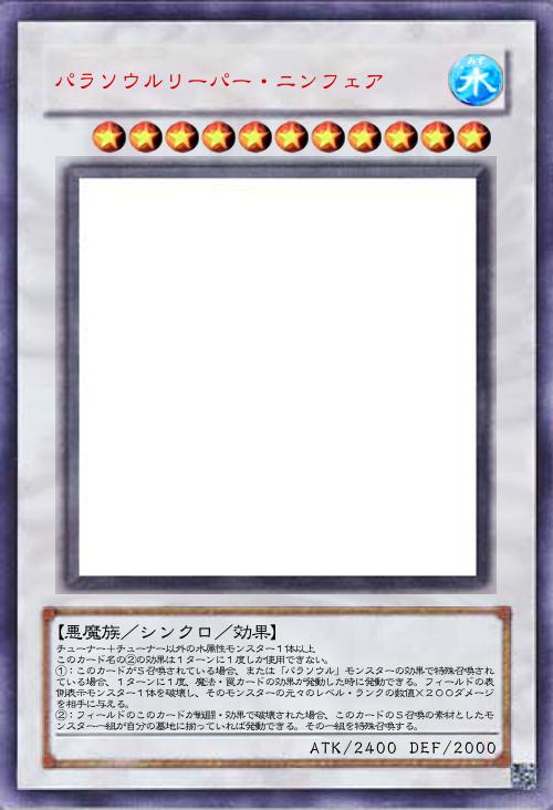 | チューナー+チューナー以外の水属性モンスター1体以上 このカード名の②の効果は1ターンに1度しか使用できない。 ①:このカードがS召喚されている場合、または「パラソウル」モンスターの効果で特殊召喚されている場合、1ターンに1度、魔法・罠カードの効果が発動した時に発動できる。フィールドの表側表示モンスター1体を破壊し、そのモンスターの元々のレベル・ランクの数値×200ダメージを相手に与える。 ②:フィールドのこのカードが戦闘・効果で破壊された場合、このカードのS召喚の素材としたモンスター一組が自分の墓地に揃っていれば発動できる。その一組を特殊召喚する。 | |||