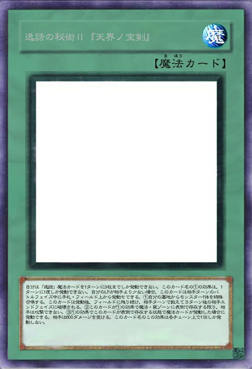 | 自分は「逸話」魔法カードを1ターンに3枚までしか発動できない。このカード名の①の効果は、1ターンに1度しか発動できない。自分のLPが相手より少ない場合、このカードは相手ターンのバトルフェイズ中に手札・フィールド上から発動もできる。①自分の墓地からモンスター1体を特殊召喚する。このカードは発動後、フィールドに残り続け、相手ターンで数えて3ターン後の相手エンドフェイズに破壊される。②このカードが①の効果で魔法・罠ゾーンに表側で存在する限り、相手は攻撃できない。③①の効果でこのカードが表側で存在する状態で魔法カードが発動した場合に発動できる。相手は600ダメージを受ける。このカード名のこの効果は各チェーン上で1回しか発動しない。 | |||