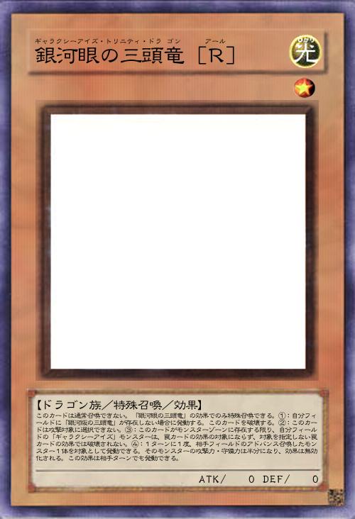 | このカードは通常召喚できない。「銀河眼の三頭竜」の効果でのみ特殊召喚できる。①:自分フィールドに「銀河版の三頭竜」が存在しない場合に発動する。このカードを破壊する。②:このカードは攻撃対象に選択できない。③:このカードがモンスターゾーンに存在する限り、自分フィールドの「ギャラクシーアイズ」モンスターは、罠カードの効果の対象にならず、対象を指定しない罠カードの効果では破壊されない。④:1ターンに1度、相手フィールドのアドバンス召喚したモンスター1体を対象として発動できる。そのモンスターの攻撃力・守備力は半分になり、効果は無効化される。この効果は相手ターンでも発動できる。 | |||