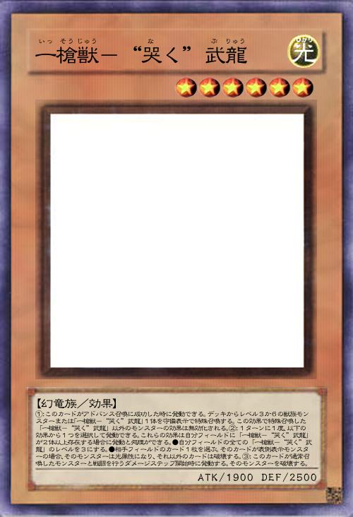 | ①:このカードがアドバンス召喚に成功した時に発動できる。デッキからレベル3か6の獣族モンスターまたは「一槍獣-“哭く”武龍」1体を守備表示で特殊召喚する。この効果で特殊召喚した「一槍獣-“哭く”武龍」以外のモンスターの効果は無効化される。②:1ターンに1度、以下の効果から1つを選択して発動できる。これらの効果は自分フィールドに「一槍獣-“哭く”武龍」が2体以上存在する場合に発動と処理ができる。●自分フィールドの全ての「一槍獣-“哭く”武龍」のレベルを3にする。●相手フィールドのカード1枚を選ぶ。そのカードが表側表示モンスターの場合、そのモンスターは光属性になり、それ以外のカードは破壊する。③:このカードが通常召喚したモンスターと戦闘を行うダメージステップ開始時に発動する。そのモンスターを破壊する。 | |||
