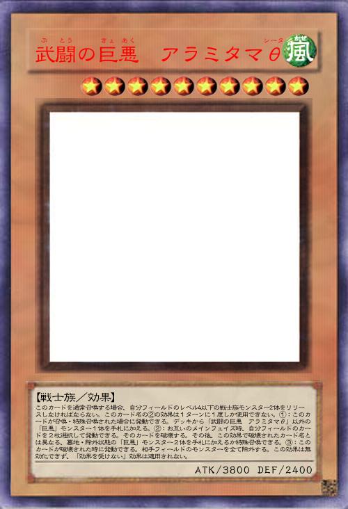 | このカードを通常召喚する場合、自分フィールドのレベル4以下の戦士族モンスター2体をリリースしなければならない。このカード名の②の効果は1ターンに1度しか使用できない。①:このカードが召喚・特殊召喚された場合に発動できる。デッキから「武闘の巨悪 アラミタマθ」以外の「巨悪」モンスター1体を手札に加える。②:お互いのメインフェイズ時、自分フィールドのカードを2枚選択して発動できる。そのカードを破壊する。その後、この効果で破壊されたカード名とは異なる、墓地・除外状態の「巨悪」モンスター2体を手札に加えるか特殊召喚できる。③:このカードが破壊された時に発動できる。相手フィールドのモンスターを全て除外する。この効果は無効化できず、「効果を受けない」効果は適用されない。 | |||