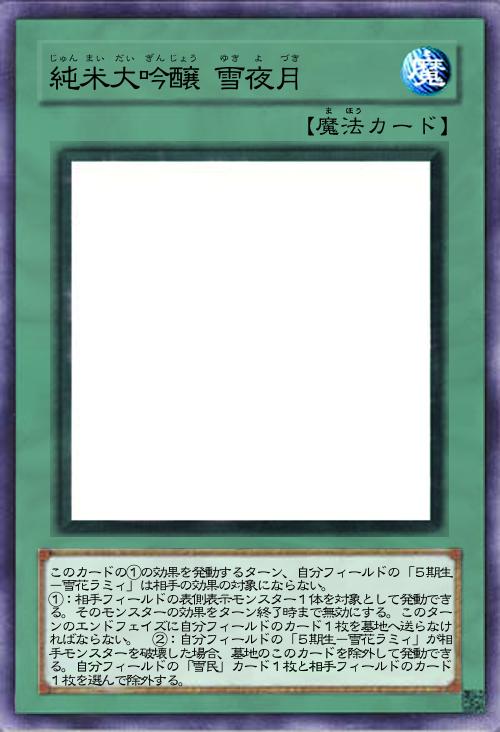 | このカードの①の効果を発動するターン、自分フィールドの「5期生-雪花ラミィ」は相手の効果の対象にならない。 ①:相手フィールドの表側表示モンスター1体を対象として発動できる。そのモンスターの効果をターン終了時まで無効にする。このターンのエンドフェイズに自分フィールドのカード1枚を墓地へ送らなければならない。 ②:自分フィールドの「5期生-雪花ラミィ」が相手モンスターを破壊した場合、墓地のこのカードを除外して発動できる。自分フィールドの「雪民」カード1枚と相手フィールドのカード1枚を選んで除外する。 | |||