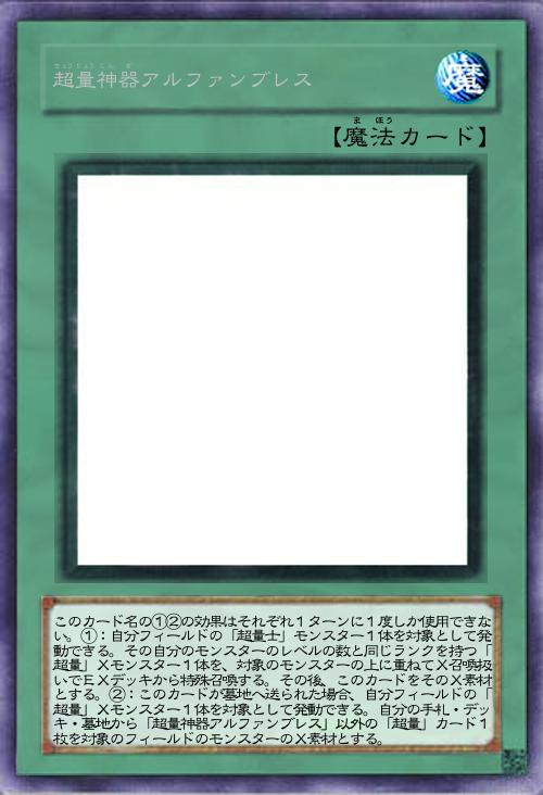 | このカード名の①②の効果はそれぞれ1ターンに1度しか使用できない。①:自分フィールドの「超量士」モンスター1体を対象として発動できる。その自分のモンスターのレベルの数と同じランクを持つ「超量」Xモンスター1体を、対象のモンスターの上に重ねてX召喚扱いでEXデッキから特殊召喚する。その後、このカードをそのX素材とする。②:このカードが墓地へ送られた場合、自分フィールドの「超量」Xモンスター1体を対象として発動できる。自分の手札・デッキ・墓地から「超量神器アルファンブレス」以外の「超量」カード1枚を対象のフィールドのモンスターのX素材とする。 | |||
