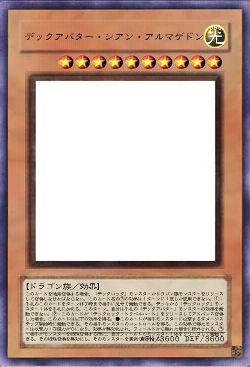 | このカードを通常召喚する場合、「デックロック」モンスターかドラゴン族モンスターをリリースして召喚しなければならない。このカード名の③の効果は1ターンに1度しか使用できない。①:手札のこのカードをターン終了時まで相手に見せて発動できる。デッキから「デックロック」モンスター1体を手札に加える。このターン、自分は手札の「デックアバター」モンスターの効果を発動できない。②:このカードが「デックロック・トラベルハート」をリリースしてアドバンス召喚した場合、このカードは以下の効果を得る。●このカードが相手モンスターに攻撃するダメージステップ開始時に発動できる。その相手モンスターのコントロールを得る。この効果で得たモンスターは攻撃力・守備力が0になり、効果が無効化され、フィールドから離れた場合に除外される。③:相手がモンスターを特殊召喚する際に、自分フィールドのモンスター1体をリリースして発動できる。その特殊召喚を無効にし、そのモンスターを裏側で除外する。 | |||