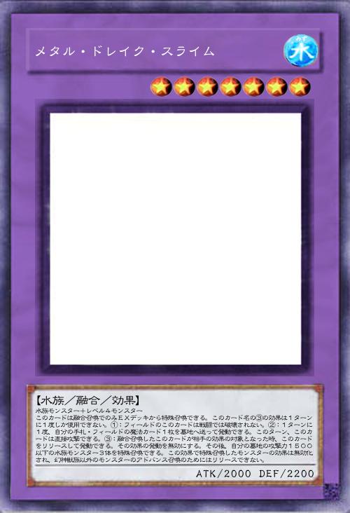 | 水族モンスター+レベル4モンスター このカードは融合召喚でのみEXデッキから特殊召喚できる。このカード名の③の効果は1ターンに1度しか使用できない。①:フィールドのこのカードは戦闘では破壊されない。②:1ターンに1度、自分の手札・フィールドの魔法カード1枚を墓地へ送って発動できる。このターン、このカードは直接攻撃できる。③:融合召喚したこのカードが相手の効果の対象となった時、このカードをリリースして発動できる。その効果の発動を無効にする。その後、自分の墓地の攻撃力1500以下の水族モンスター3体を特殊召喚できる。この効果で特殊召喚したモンスターの効果は無効化され、幻神獣族以外のモンスターのアドバンス召喚のためにはリリースできない。 | |||