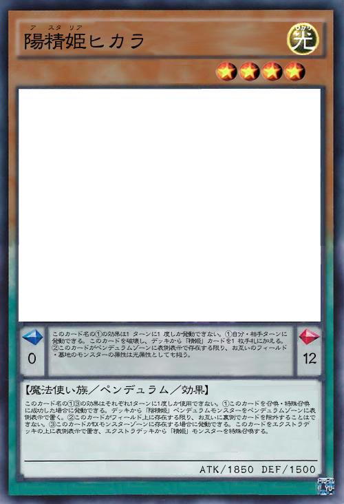 | このカード名の①の効果は1ターンに1度しか発動できない。①自分・相手ターンに発動できる。このカードを破壊し、デッキから「精姫」カードを1枚手札に加える。②このカードがペンデュラムゾーンに表側表示で存在する限り、お互いのフィールド・墓地のモンスターの属性は光属性としても扱う。 | |||
