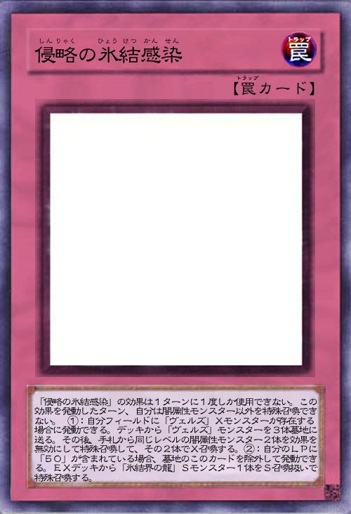 | 「侵略の氷結感染」の効果は1ターンに1度しか使用できない。この効果を発動したターン、自分は闇属性モンスター以外を特殊召喚できない。 ①:自分フィールドに「ヴェルズ」Xモンスターが存在する場合に発動できる。デッキから「ヴェルズ」モンスターを3体墓地に送る。その後、手札から同じレベルの闇属性モンスター2体を効果を無効にして特殊召喚して、その2体でX召喚する。②:自分のLPに「50」が含まれている場合、墓地のこのカードを除外して発動できる。EXデッキから「氷結界の龍」Sモンスター1体をS召喚扱いで特殊召喚する。 | |||