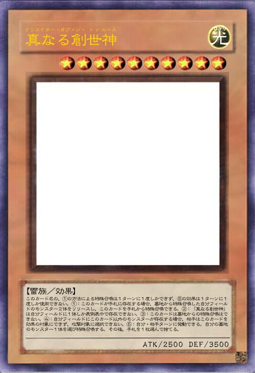 | このカード名の、①の方法による特殊召喚は1ターンに1度しかできず、⑤の効果は1ターンに1度しか使用できない。①:このカードが手札に存在する場合、墓地から特殊召喚した自分フィールドのモンスター2体をリリースし、このカードを手札から特殊召喚できる。②:「真なる創世神」は自分フィールドに1体しか表側表示で存在できない。③:このカードは墓地からの特殊召喚はできない。④:自分フィールドにこのカード以外のモンスターが存在する場合、相手はこのカードを効果の対象にできず、攻撃対象に選択できない。⑤:自分・相手ターンに発動できる。自分の墓地のモンスター1体を選び特殊召喚する。その後、手札を1枚選んで捨てる。 | |||