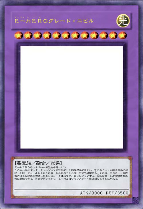 | E―HEROモンスター+原始生命態ニビル このカードはダーク・フュージョンの効果でしか特殊召喚できない。①このカードが融合召喚に成功した時、フィールド上のこのカード以外のモンスターを全て破壊する。その後、このカードの攻撃力はこの効果で破壊したモンスター1体につき、800アップする。②このカードが破壊された時に発動できる。自分のデッキから、E―HEROモンスター1体選択して手札に加える。 | |||