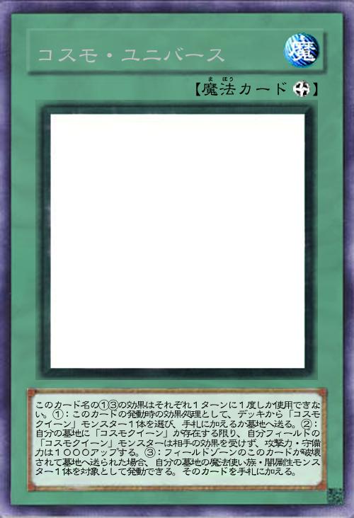 | このカード名の①③の効果はそれぞれ1ターンに1度しか使用できない。①:このカードの発動時の効果処理として、デッキから「コスモクイーン」モンスター1体を選び、手札に加えるか墓地へ送る。②:自分の墓地に「コスモクイーン」が存在する限り、自分フィールドの「コスモクイーン」モンスターは相手の効果を受けず、攻撃力・守備力は1000アップする。③:フィールドゾーンのこのカードが破壊されて墓地へ送られた場合、自分の墓地の魔法使い族・闇属性モンスター1体を対象として発動できる。そのカードを手札に加える。 | |||