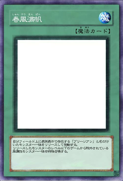 自分フィールド上に表側表示で存在する「ブリージアン」と名の付いたモンスター一体をリリースして発動する。 リリースしたモンスターのレベル以下のゲームから除外されている風属性モンスター一体を特殊召喚する。 |