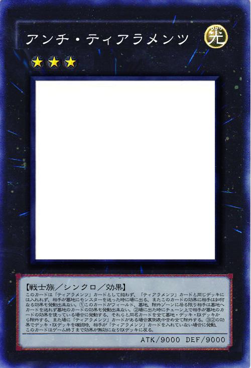 | このカードは「ティアラメンツ」カードとして扱わず、「ティアラメンツ」カードと同じデッキには入れれず、相手が墓地にモンスターを送った時に場に出る、またこのカードの効果に相手は如何なる効果も発動出来ない。①このカードがフィールド、墓地、除外ゾーンに居る限り相手は墓地へカードを送れず墓地のカードの効果も発動出来ない。②場に出た時にチェーン上で相手が墓地のカードの効果を使っている場合に発動する、それらと同名カードを全て墓地・デッキ・EXデッキから除外する、また場に「ティアラメンツ」カードがある場合裏側表示含め全て除外する。③②の効果でデッキ・EXデッキを確認時、相手が「ティアラメンツ」カードを入れていない場合に発動、このカードはゲーム終了まで効果が無効になりEXデッキに戻る。 | |||
