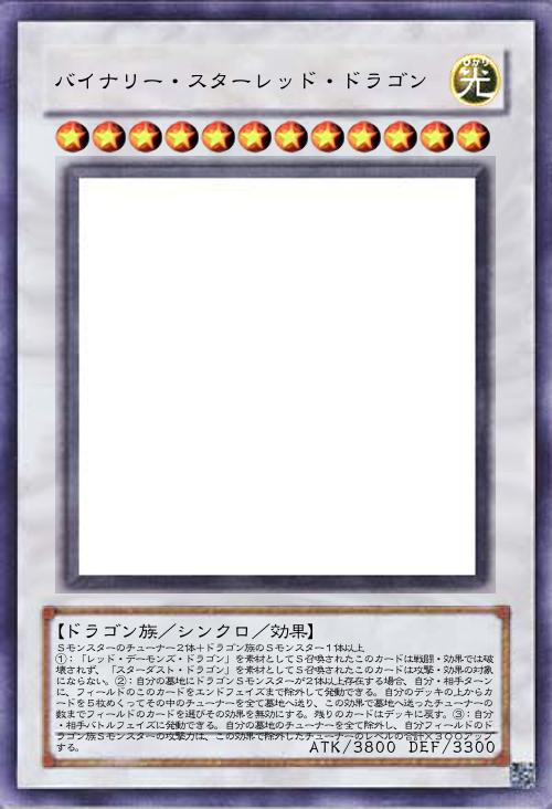 | Sモンスターのチューナー2体+ドラゴン族のSモンスター1体以上 ①:「レッド・デーモンズ・ドラゴン」を素材としてS召喚されたこのカードは戦闘・効果では破壊されず、「スターダスト・ドラゴン」を素材としてS召喚されたこのカードは攻撃・効果の対象にならない。②:自分の墓地にドラゴンSモンスターが2体以上存在する場合、自分・相手ターンに、フィールドのこのカードをエンドフェイズまで除外して発動できる。自分のデッキの上からカードを5枚めくってその中のチューナーを全て墓地へ送り、この効果で墓地へ送ったチューナーの数までフィールドのカードを選びその効果を無効にする。残りのカードはデッキに戻す。③:自分・相手バトルフェイズに発動できる。自分の墓地のチューナーを全て除外し、自分フィールドのドラゴン族Sモンスターの攻撃力は、この効果で除外したチューナーのレベルの合計×300アップする。 | |||