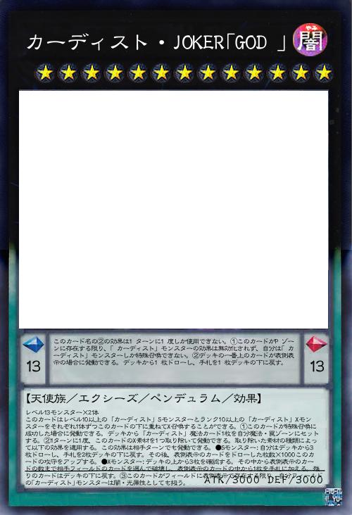 | レベル13モンスター×2体 このカードはレベル10以上の「カーディスト」Sモンスターとランク10以上の「カーディスト」Xモンスターをそれぞれ1体ずつこのカードの下に重ねてX召喚することができる。①このカードが特殊召喚に成功した場合に発動できる。デッキから「カーディスト」魔法カード1枚を自分魔法・罠ゾーンにセットする。②1ターンに1度、このカードのX素材を1つ取り除いて発動できる。取り除いた素材の種類によって以下の効果を適用する。この効果は相手ターンでも発動できる。●Sモンスター:自分はデッキから3枚ドローし、手札を2枚デッキの下に戻す。その後、表側表示のカードをドローした枚数×1000このカードの攻守をアップする。●Xモンスター:デッキの上から3枚を確認する。その中から表側表示のカードの数まで相手フィールドのカードを選んで破壊し、表側表示のカードの中から1枚を手札に加える。残りのカードはデッキの下に戻す。③このカードがフィールドに表側表示で存在する限り、自分フィールドの「カーディスト」モンスターは闇・光属性としても扱う。 | |||