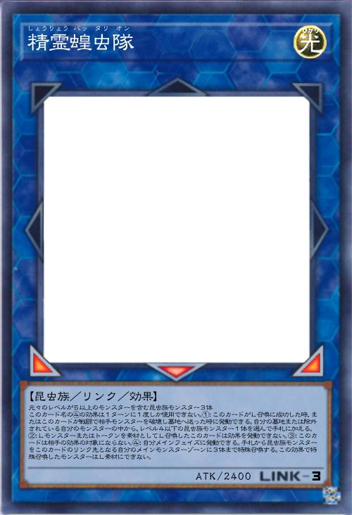 | 元々のレベルが5以上のモンスターを含む昆虫族モンスター3体 このカード名の④の効果は1ターンに1度しか使用できない。①:このカードがL召喚に成功した時、またはこのカードが戦闘で相手モンスターを破壊し墓地へ送った時に発動できる。自分の墓地または除外されている自分のモンスターの中から、レベル4以下の昆虫族モンスター1体を選んで手札に加える。 ②:Lモンスターまたはトークンを素材としてL召喚したこのカードは効果を発動できない。③:このカードは相手の効果の対象にならない。④:自分メインフェイズに発動できる。手札から昆虫族モンスターをこのカードのリンク先となる自分のメインモンスターゾーンに3体まで特殊召喚する。この効果で特殊召喚したモンスターはL素材にできない。 | |||