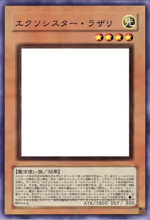 | このカード名の①②の効果はそれぞれ1ターンに1度しか使用できない。①:自分フィールドにモンスターが存在しない場合、自分・相手メインフェイズに発動できる。このカードを手札から特殊召喚し、デッキから「エクソシスター・エリス」か「エクソシスター・マルファ」1体を選び手札に加える。その後、手札からレベル4モンスター1体を召喚できる。②:このカードが召喚・特殊召喚した場合に発動できる。自分・相手の墓地のカード1枚を選んで除外し、デッキから「エクソシスター」魔法・罠カード1枚を自分フィールドにセットする。この効果でセットした速攻魔法・罠カードは、自分フィールドにXモンスターが存在する限りセットしたターンでも発動できる。③:このカードを素材としてX召喚した「エクソシスター」Xモンスターは以下の効果を得る。●このカードをX召喚したターン、相手の墓地から手札・デッキ・EXデッキに戻るカードは代わりに除外される。 | |||