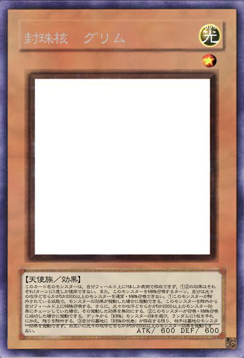 | このカード名のモンスターは、自分フィールド上に1体しか表側で存在できず、①②の効果はそれぞれ1ターンに1度しか使用できない。また、このモンスターを特殊召喚するターン、自分は元々の攻守どちらかが0か2500以上のモンスターを通常・特殊召喚できない。①このモンスターが除外されている状態で、モンスターの効果が発動した場合に発動できる。このモンスターを除外から自分フィールド上に特殊召喚する。さらに、元々の攻守どちらかが0か2500以上のモンスター効果にチェーンしていた場合、その発動した効果を無効にする。②このモンスターが召喚・特殊召喚に成功した場合に発動できる。デッキから「封珠」モンスター2体を選び、ランダムに1枚を手札に加え、残りを除外する。③自分の墓地に「封珠の呪巻」が存在する限り、相手は墓地のモンスター効果を発動できず、お互いに元々の攻守どちらかが0か2500以上のモンスター効果を発動できない。 | |||