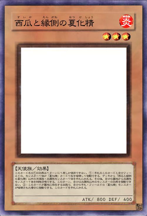 | このカード名の①の効果は1ターンに1度しか使用できない。①:手札のこのカードと自分フィールドの、モンスター1体か「夏化精」カード1枚を破壊して発動できる。デッキから「西瓜と縁側の夏化精」以外の天使族・炎属性モンスター1体を手札に加える。その後、自分の墓地から炎属性モンスター1体を特殊召喚できる。このターン、自分は炎属性以外のモンスターの効果を発動できない。②:このカードが墓地に存在する状態で、自分の手札・フィールドの「夏化精」モンスターが破壊された場合に発動できる。このカードを手札に加える。 | |||