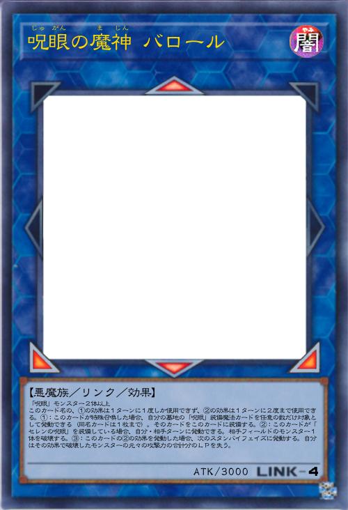 | 「呪眼」モンスター2体以上 このカード名の、①の効果は1ターンに1度しか使用できず、②の効果は1ターンに2度まで使用できる。①:このカードが特殊召喚した場合、自分の墓地の「呪眼」装備魔法カードを任意の数だけ対象として発動できる(同名カードは1枚まで)。そのカードをこのカードに装備する。②:このカードが「セレンの呪眼」を装備している場合、自分・相手ターンに発動できる。相手フィールドのモンスター1体を破壊する。③:このカードの②の効果を発動した場合、次のスタンバイフェイズに発動する。自分はその効果で破壊したモンスターの元々の攻撃力の合計分のLPを失う。 | |||