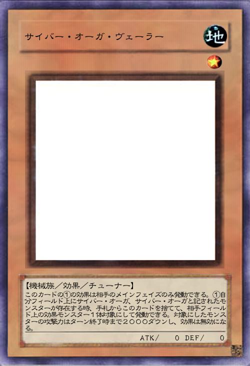 | このカードの①の効果は相手のメインフェイズのみ発動できる。①自分フィールド上にサイバー・オーガ、サイバー・オーガと記されたモンスターが存在する時、手札からこのカードを捨てて、相手フィールド上の効果モンスター1体対象にして発動できる。対象にしたモンスターの攻撃力はターン終了時まで2000ダウンし、効果は無効になる。 | |||