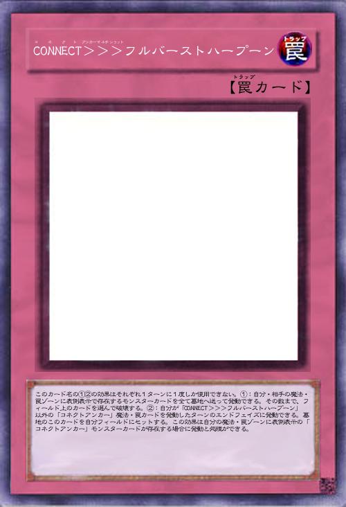 | このカード名の①②の効果はそれぞれ1ターンに1度しか使用できない。①:自分・相手の魔法・罠ゾーンに表側表示で存在するモンスターカードを全て墓地へ送って発動できる。その数まで、フィールド上のカードを選んで破壊する。②:自分が「CONNECT>>>フルバーストハープーン」以外の「コネクトアンカー」魔法・罠カードを発動したターンのエンドフェイズに発動できる。墓地のこのカードを自分フィールドにセットする。この効果は自分の魔法・罠ゾーンに表側表示の「コネクトアンカー」モンスターカードが存在する場合に発動と処理ができる。 | |||