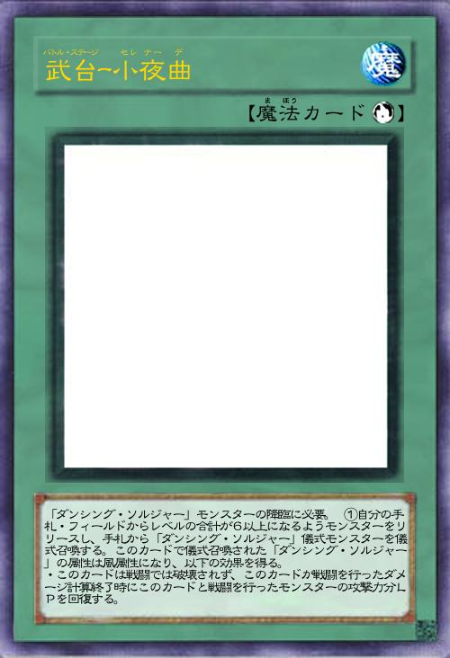 | 「ダンシング・ソルジャー」モンスターの降臨に必要。 ①自分の手札・フィールドからレベルの合計が6以上になるようモンスターをリリースし、手札から「ダンシング・ソルジャー」儀式モンスターを儀式召喚する。このカードで儀式召喚された「ダンシング・ソルジャー」の属性は風属性になり、以下の効果を得る。 ・このカードは戦闘では破壊されず、このカードが戦闘を行ったダメージ計算終了時にこのカードと戦闘を行ったモンスターの攻撃力分LPを回復する。 | |||