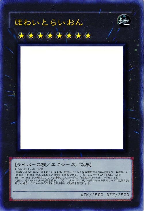 | レベル8モンスター5体 「ほわいとらいおん」は1ターンに1度、自分フィールドのX素材を4つ以上持った「5期生-Lioness' Pride」の上に重ねてX召喚する事もできる。 ①:このカードが「5期生-Lioness' Pride」をX素材にしている場合、このカードは「5期生-Lioness' Pride」として扱い、そのモンスター効果を得る。 ②:1ターンに1度、相手フィールドでカードの効果が発動した場合、このカードのX素材を取り除いて効果を無効にする。 | |||