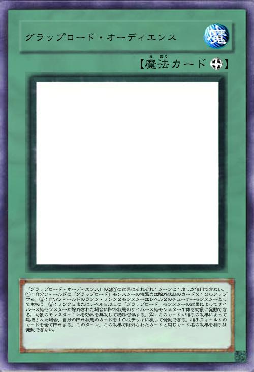 | 「グラップロード・オーディエンス」の③④の効果はそれぞれ1ターンに1度しか使用できない。①:自分フィールドの「グラップロード」モンスターの攻撃力は除外状態のカード×100アップする。②:自分フィールドのランク・リンク2モンスターはレベル2のチューナーモンスターとしても扱う。③:リンク2またはレベル8以上の「グラップロード」モンスターの効果によってサイバース族モンスターが除外された場合に除外状態のサイバース族モンスター1体を対象に発動できる。対象のモンスター1体を効果を無効して特殊召喚する。④:このカードが相手の効果によって破壊された場合、自分の除外状態のカードを10枚デッキに戻して発動できる。相手フィールドのカードを全て除外する。このターン、この効果で除外されたカードと同じカード名の効果を相手は発動できない。 | |||