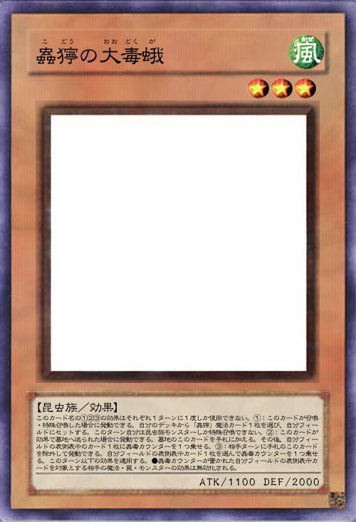 | このカード名の①②③の効果はそれぞれ1ターンに1度しか使用できない。①:このカードが召喚・特殊召喚した場合に発動できる。自分のデッキから「蟲獰」魔法カード1枚を選び、自分フィールドにセットする。このターン自分は昆虫族モンスターしか特殊召喚できない。②:このカードが効果で墓地へ送られた場合に発動できる。墓地のこのカードを手札に加える。その後、自分フィールドの表側表示のカード1枚に蟲毒カウンターを1つ乗せる。③:相手ターンに手札のこのカードを除外して発動できる。自分フィールドの表側表示カード1枚を選んで蟲毒カウンターを1つ乗せる。このターン以下の効果を適用する。●蟲毒カウンターが置かれた自分フィールドの表側表示カードを対象とする相手の魔法・罠・モンスターの効果は無効化される。 | |||