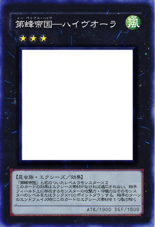 「第蜂帝国」と名のついたレベル3モンスター×2 このカードの効果はエクシーズ素材がなければ適応されない。相手フィールド上に存在するモンスターの攻撃力・守備力はそのモンスターのレベルまたはランク×100ポイントダウンする。相手のターンのエンドフェイズ時にこのカードのエクシーズ素材を1つ取り除く。 |
