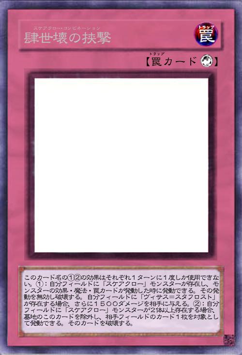 | このカード名の①②の効果はそれぞれ1ターンに1度しか使用できない。①:自分フィールドに「スケアクロー」モンスターが存在し、モンスターの効果・魔法・罠カードが発動した時に発動できる。その発動を無効し破壊する。自分フィールドに「ヴィサス=スタフロスト」が存在する場合、さらに1500ダメージを相手に与える。②:自分フィールドに「スケアクロー」モンスターが2体以上存在する場合、墓地のこのカードを除外し、相手フィールドのカード1枚を対象として発動できる。そのカードを破壊する。 | |||