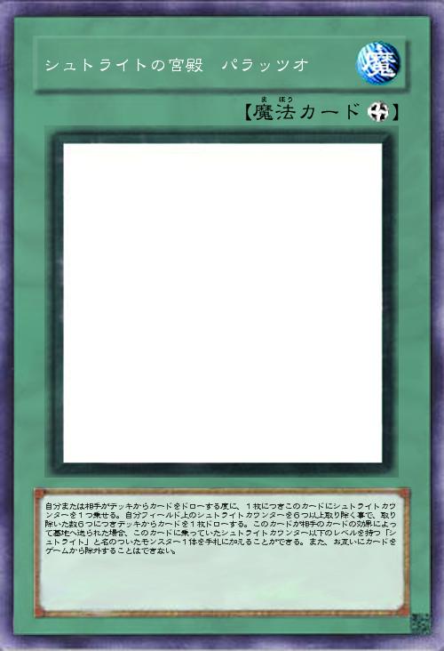 | 自分または相手がデッキからカードをドローする度に、1枚につきこのカードにシュトライトカウンターを1つ乗せる。自分フィールド上のシュトライトカウンターを6つ以上取り除く事で、取り除いた数6つにつきデッキからカードを1枚ドローする。このカードが相手のカードの効果によって墓地へ送られた場合、このカードに乗っていたシュトライトカウンター以下のレベルを持つ「シュトライト」と名のついたモンスター1体を手札に加えることができる。また、お互いにカードをゲームから除外することはできない。 | |||