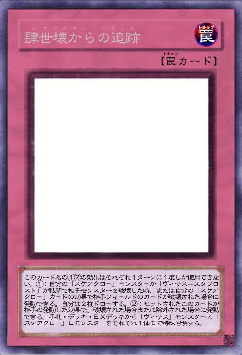 | このカード名の①②の効果はそれぞれ1ターンに1度しか使用できない。①:自分の「スケアクロー」モンスターか「ヴィサス=スタフロスト」が戦闘で相手モンスターを破壊した時、または自分の「スケアクロー」カードの効果で相手フィールドのカードが破壊された場合に発動できる。自分は2枚ドローする。②:セットされたこのカードが相手の発動した効果で、破壊された場合または除外された場合に発動できる。手札・デッキ・EXデッキから「ヴィサス」モンスターと「スケアクロー」Lモンスターをそれぞれ1体まで特殊召喚する。 | |||
