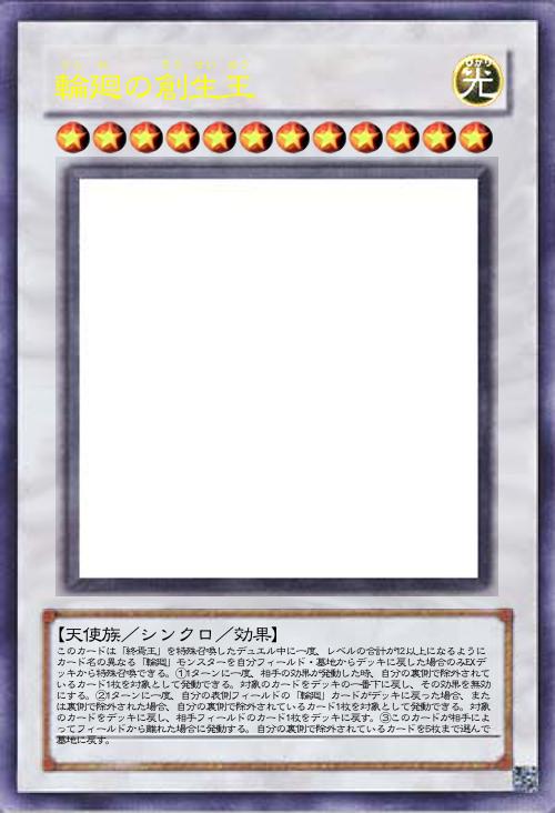 | このカードは「終焉王」を特殊召喚したデュエル中に一度、レベルの合計が12以上になるようにカード名の異なる「輪廻」モンスターを自分フィールド・墓地からデッキに戻した場合のみEXデッキから特殊召喚できる。①1ターンに一度、相手の効果が発動した時、自分の裏側で除外されているカード1枚を対象として発動できる。対象のカードをデッキの一番下に戻し、その効果を無効にする。②1ターンに一度、自分の表側フィールドの「輪廻」カードがデッキに戻った場合、または裏側で除外された場合、自分の裏側で除外されているカード1枚を対象として発動できる。対象のカードをデッキに戻し、相手フィールドのカード1枚をデッキに戻す。③このカードが相手によってフィールドから離れた場合に発動する。自分の裏側で除外されているカードを5枚まで選んで墓地に戻す。 | |||