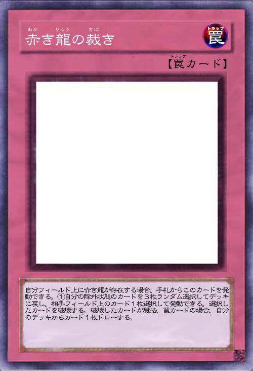 | 自分フィールド上に赤き龍が存在する場合、手札からこのカードを発動できる。①自分の除外状態のカードを3枚ランダム選択してデッキに戻し、相手フィールド上のカード1枚選択して発動できる。選択したカードを破壊する。破壊したカードが魔法、罠カードの場合、自分のデッキからカード1枚ドローする。 | |||