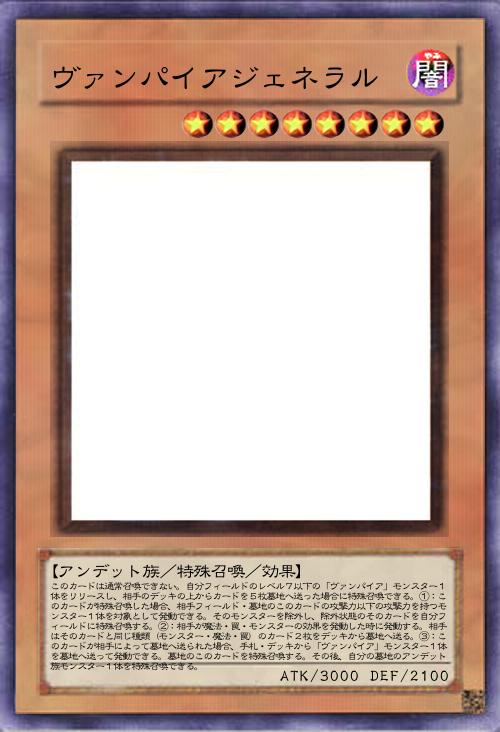 | このカードは通常召喚できない。自分フィールドのレベル7以下の「ヴァンパイア」モンスター1体をリリースし、相手のデッキの上からカードを5枚墓地へ送った場合に特殊召喚できる。①:このカードが特殊召喚した場合、相手フィールド・墓地のこのカードの攻撃力以下の攻撃力を持つモンスター1体を対象として発動できる。そのモンスターを除外し、除外状態のそのカードを自分フィールドに特殊召喚する。②:相手が魔法・罠・モンスターの効果を発動した時に発動する。相手はそのカードと同じ種類(モンスター・魔法・罠)のカード2枚をデッキから墓地へ送る。③:このカードが相手によって墓地へ送られた場合、手札・デッキから「ヴァンパイア」モンスター1体を墓地へ送って発動できる。墓地のこのカードを特殊召喚する。その後、自分の墓地のアンデット族モンスター1体を特殊召喚できる。 | |||