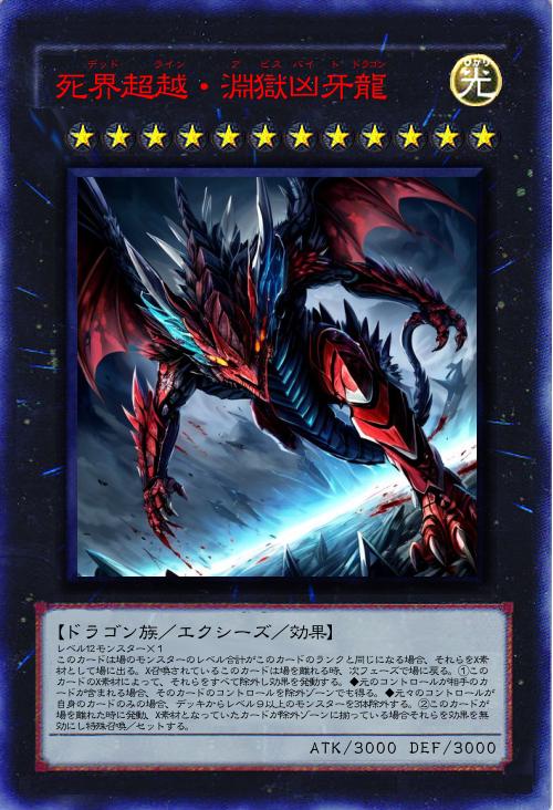 「呪われたカードをイメージした死界龍のXカード、融合が使い勝手も考慮されていたのに対し、シナジーを持つカードが限定的な上に除去効果とも取れそうな効果外テキストは文字通り呪いのごとく場になんとしても出ようとする強制能力だ、相手のモンスターを素材にする場合は制圧に対し効果外テキストでの不意打ちを喰らわせ打開できるが、自身がフィールド以外の場所にいる状態では展開中場の総レベルが12に到達した時点で場に出で除外してしまう為地雷のような存在になる。除外発動に対し事後破壊やバウンスで対処しても場に揃った時点で二体目以降の特殊召喚で条件が満たされるとまた勝手に素材にして除外するループに陥るため、特殊召喚されたモンスターを自身の手で除去するなどをしないと基本展開にも役立たないがそれも効果が無効になっているため、自身が有利な盤面においてはレベル12を真っ先に場に出し強制除外を回避することが求められる。揃った時点で場に出る効果が発動する為、一度レベル12がX素材にされたのをバウンスで起動したアビスバイトの効果で同時処理で入れ替わらせてからX召喚する事で墓地/除外ゾーン/EXデッキにいかず強制除外を免れる。正直除外ゾーン肥やしなんてメジャーじゃないどころの騒ぎじゃないので一癖二癖どころか未知数のX癖とでも書いてしまいたい程だ。