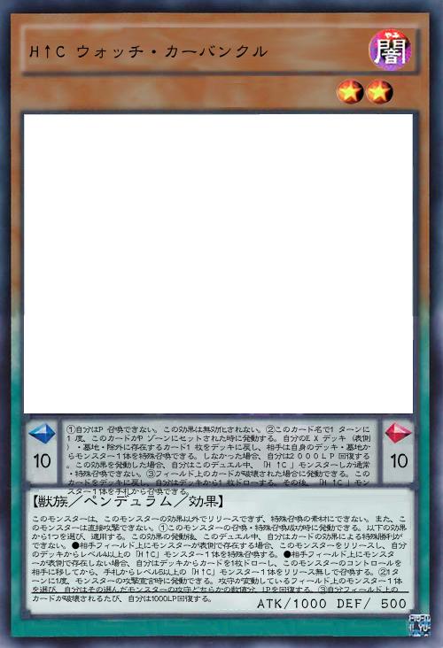 | ①自分はP召喚できない。この効果は無効化されない。②このカード名で1ターンに1度、このカードがPゾーンにセットされた時に発動する。自分のEXデッキ(表側)・墓地・除外に存在するカード1枚をデッキに戻し、相手は自身のデッキ・墓地からモンスター1体を特殊召喚できる。しなかった場合、自分は2000LP回復する。この効果を発動した場合、自分はこのデュエル中、「H↑C」モンスターしか通常・特殊召喚できない。③フィールド上のカードが破壊された場合に発動できる。このカードをデッキに戻し、自分はデッキから1枚ドローする。その後、「H↑C」モンスター1体を手札から召喚できる。 | |||