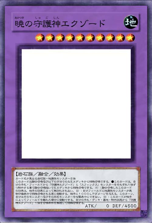 | カード名が異なる岩石族・地属性モンスター5体 このカードは融合召喚及び以下の方法でのみEXデッキから特殊召喚できる。●このカードは、自分の手札・フィールドから「守護神エクゾード」と「スフィンクス」モンスターをそれぞれ1体ずつ除外する事で融合召喚扱いでEXデッキから特殊召喚できる。(1):融合召喚したこのカードの効果は、相手の効果によって無効化されない。(2):自分フィールドに地属性モンスターが表側守備表示で特殊召喚される度に発動する。相手に1000LPダメージを与える。このターン、自分はそのモンスター及びその同名モンスターを攻撃表示にできない。(3):このカードが相手によってフィールドを離れた場合に発動できる。自分の手札・デッキ・墓地・除外状態から「守護神エクゾード」1体を召喚条件を無視して特殊召喚する。 | |||