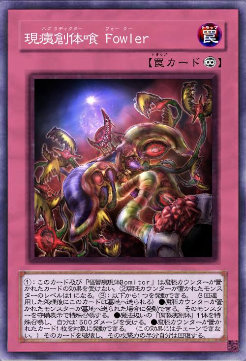 | ①:このカード及び「嘔蕾痍現体Bomitor」は腐胚カウンターが置かれたカードの効果を受けない。②腐胚カウンターが置かれたモンスターのレベルは1になる。③:以下から1つを発動できる。(3回適用した処理後にこのカードは墓地へ送られる)●腐胚カウンターが置かれたモンスターが墓地へ送られた場合に発動できる。そのモンスターを守備表示で特殊召喚する。●魔法扱いの「偶像痍創体」1体を特殊召喚し、自分は1500ダメージを受ける。●腐胚カウンターが置かれたカード1枚を対象に発動できる。(この効果にはチェーンできない。)そのカードを破壊し、その攻撃力の半分自分は回復する。 | |||