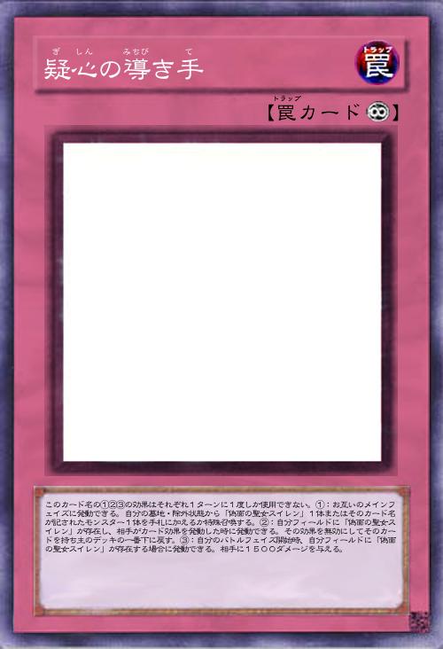 | このカード名の①②③の効果はそれぞれ1ターンに1度しか使用できない。①:お互いのメインフェイズに発動できる。自分の墓地・除外状態から「偽面の聖女スイレン」1体またはそのカード名が記されたモンスター1体を手札に加えるか特殊召喚する。②:自分フィールドに「偽面の聖女スイレン」が存在し、相手がカード効果を発動した時に発動できる。その効果を無効にしてそのカードを持ち主のデッキの一番下に戻す。③:自分のバトルフェイズ開始時、自分フィールドに「偽面の聖女スイレン」が存在する場合に発動できる。相手に1500ダメージを与える。 | |||