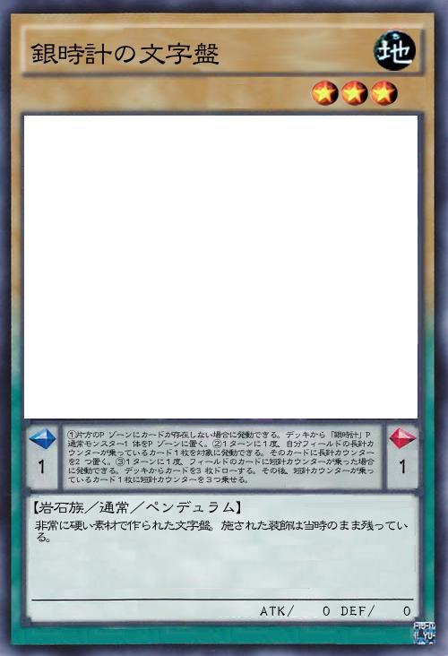 | ①片方のPゾーンにカードが存在しない場合に発動できる。デッキから「銀時計」P通常モンスター1体をPゾーンに置く。②1ターンに1度、自分フィールドの長針カウンターが乗っているカード1枚を対象に発動できる。そのカードに長針カウンターを2つ置く。③1ターンに1度、フィールドのカードに短針カウンターが乗った場合に発動できる。デッキからカードを3枚ドローする。その後、短針カウンターが乗っているカード1枚に短針カウンターを3つ乗せる。 | |||