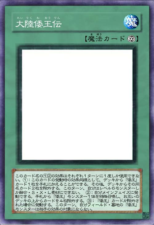 | このカード名の①②の効果はそれぞれ1ターンに1度しか使用できない。①:このカードの発動時の効果処理として、デッキから「倭王」カード1枚を手札に加えることができる。その後、デッキからその同名カード2枚を除外する。このターン、自分はレベル6モンスターしか融合・S・X・L素材にできない。 ②:自分メインフェイズに発動できる。手札から「倭王」モンスター1体を特殊召喚し、お互いのデッキの上からカードを4枚除外する。③:「倭王」カードが除外された場合に発動する。このターン、自分フィールド・墓地の「倭王」モンスターは相手の効果の対象にならない。 | |||