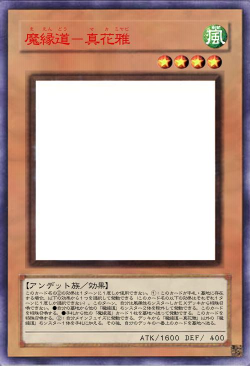 | このカード名の②の効果は1ターンに1度しか使用できない。①:このカードが手札・墓地に存在する場合、以下の効果から1つを選択して発動できる(このカード名の以下の効果はそれぞれ1ターンに1度しか選択できない)。このターン、自分は風属性モンスターしかEXデッキから特殊召喚できない。●自分の墓地から他の「魔縁道」モンスター2体を除外して発動できる。このカードを特殊召喚する。●手札から他の「魔縁道」カード1枚を墓地へ送って発動できる。このカードを特殊召喚する。②:自分メインフェイズに発動できる。デッキから「魔縁道-真花雅」以外の「魔縁道」モンスター1体を手札に加える。その後、自分のデッキの一番上のカードを墓地へ送る。 | |||