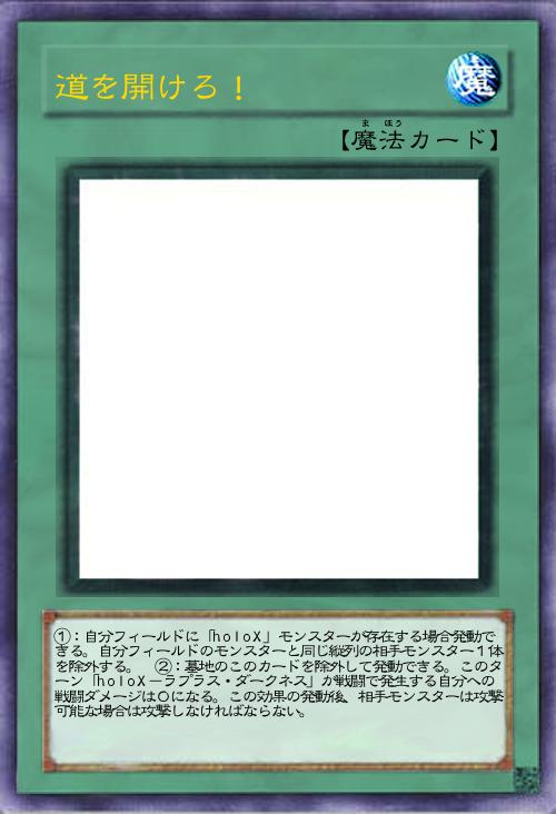 | ①:自分フィールドに「holoX」モンスターが存在する場合発動できる。自分フィールドのモンスターと同じ縦列の相手モンスター1体を除外する。 ②:墓地のこのカードを除外して発動できる。このターン「holoX-ラプラス・ダークネス」が戦闘で発生する自分への戦闘ダメージは0になる。この効果の発動後、相手モンスターは攻撃可能な場合は攻撃しなければならない。 | |||